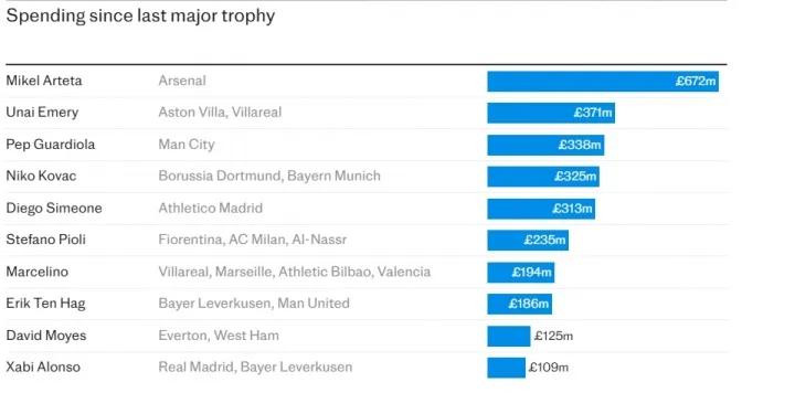 Telecom đã đếm chi tiêu tích lũy của các huấn luyện viên lớn trong các bản hợp đồng sau chức vô địch cuối cùng, Arteta đã chi 672 triệu bảng để dẫn đầu khoảng cách.
