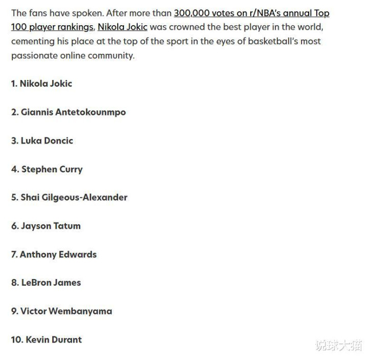 Chủ đề tốt nhất là phổ biến trong NBA. Giờ đây, R/NBA đã phát động một cuộc bỏ phiếu trong khoảng 100 người chơi hàng đầu của năm và thông tin cho thấy 300.000 người hâm mộ có liên quan. Như sau, hãy để thảo luận và xem xét các ngôi sao quen thuộc và bảng xếp hạng liên quan.